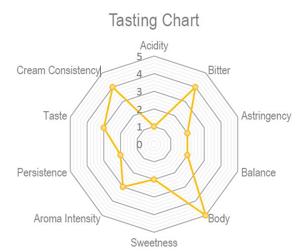 The union between excellent Arabica and Robusta coffees has enabled us to obtain this blend with a particularly intense taste and with delicate notes of cocoa and bitter chocolate. The cream, with its typical dark brown color, is thick and compact. The decidedly structured body gives us a full and decisive taste.